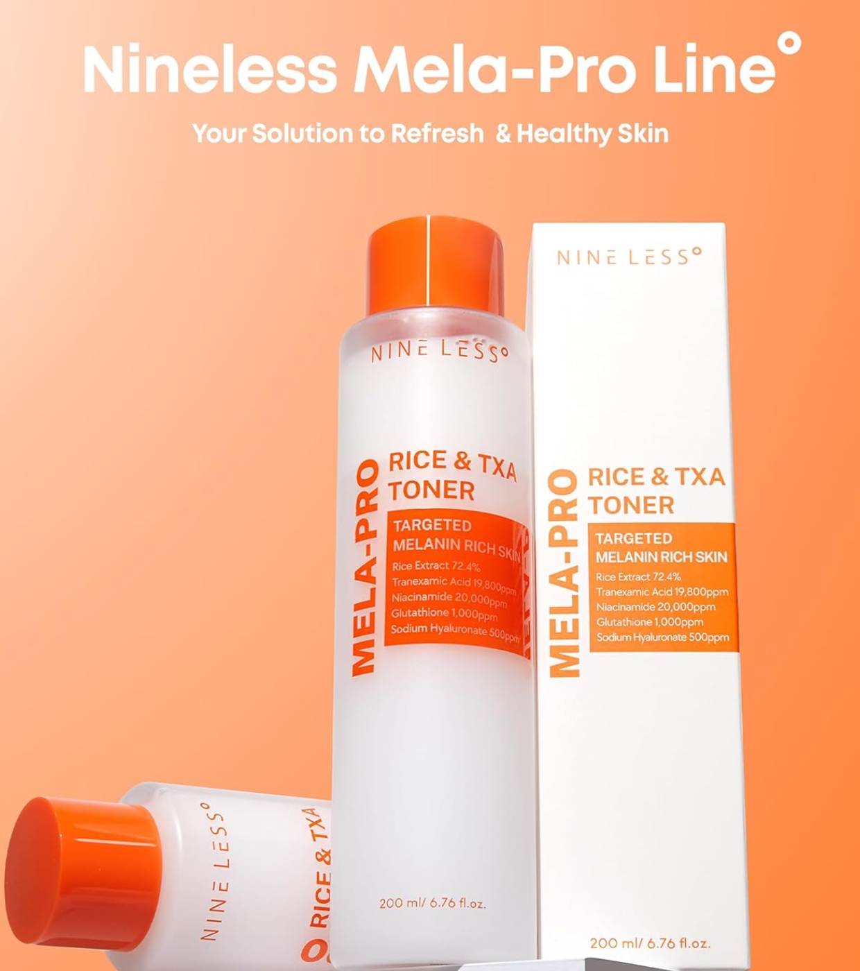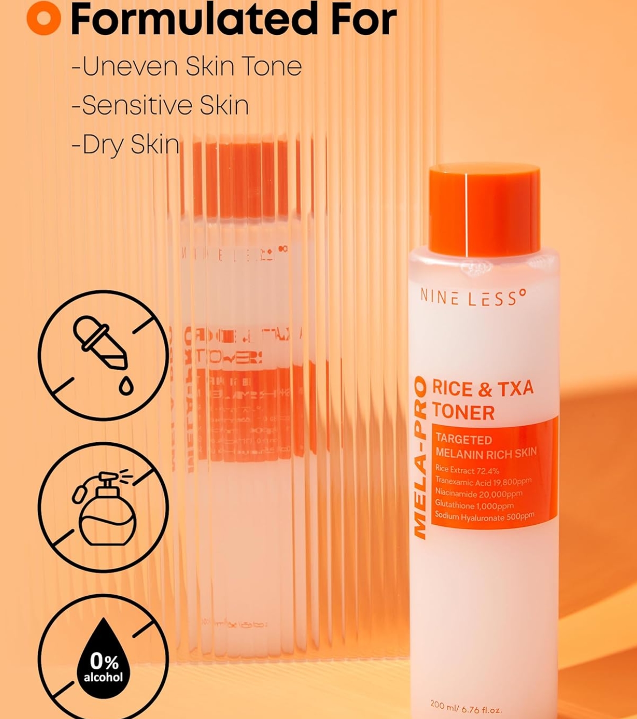 Il tonico viso Nineless Rice e Nineless è studiato per trattare efficacemente macchie scure, iperpigmentazione e colorito non uniforme della pelle.