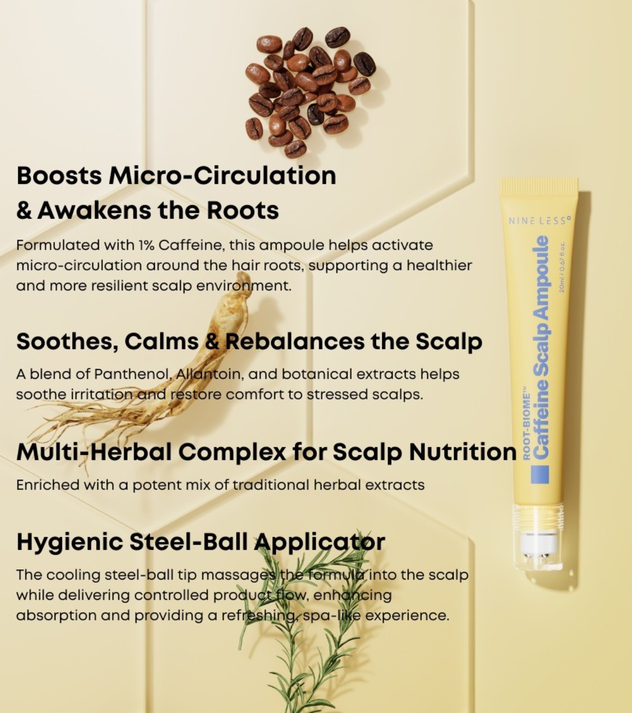 Rafforza e nutri il tuo bioma naturale dei capelli con questa fiala intensiva per il cuoio capelluto di Nineless , formulata con caffeina e arricchita con pantenolo e mentolo per offrire un'immediata sensazione di freschezza e sollievo.