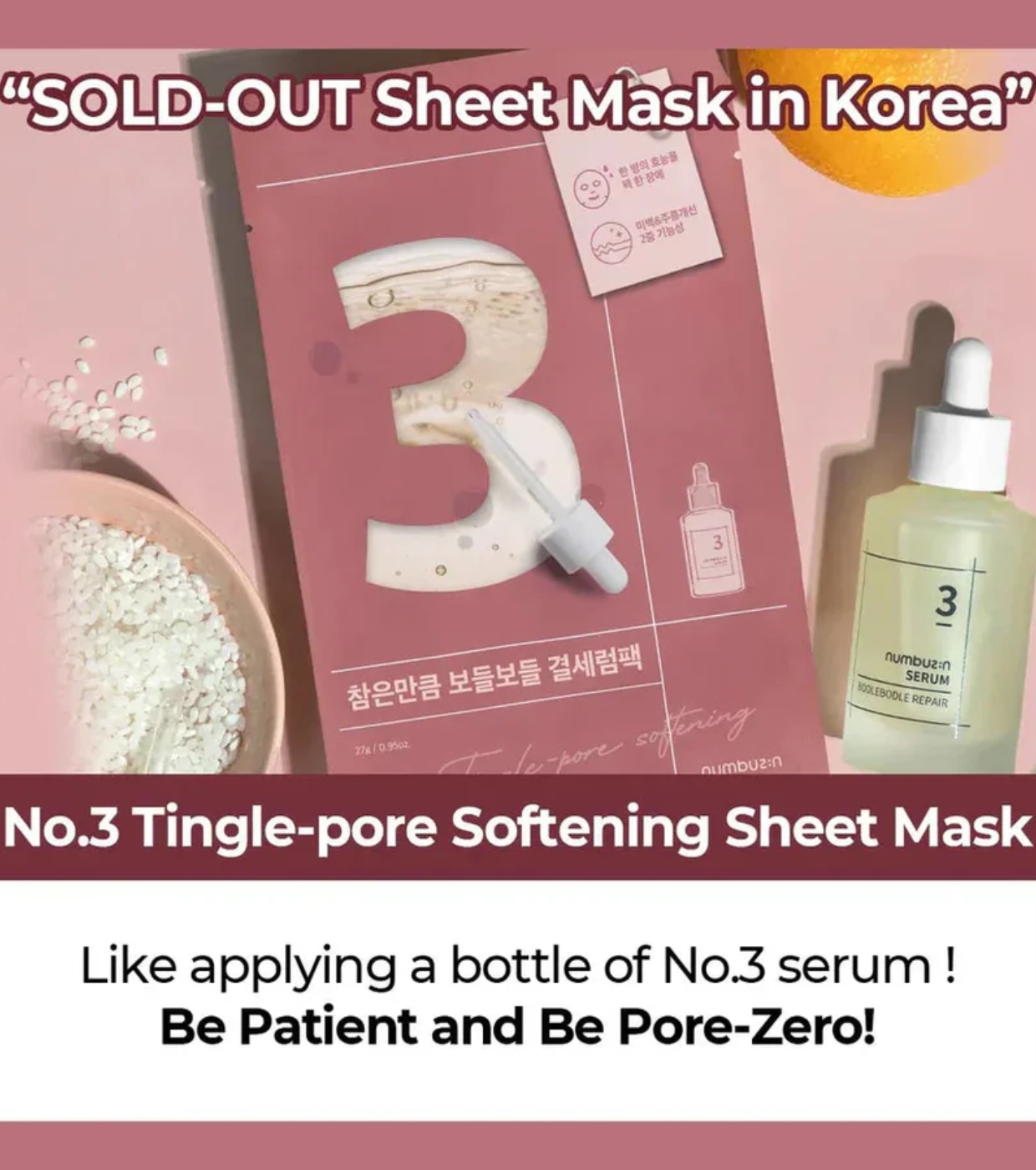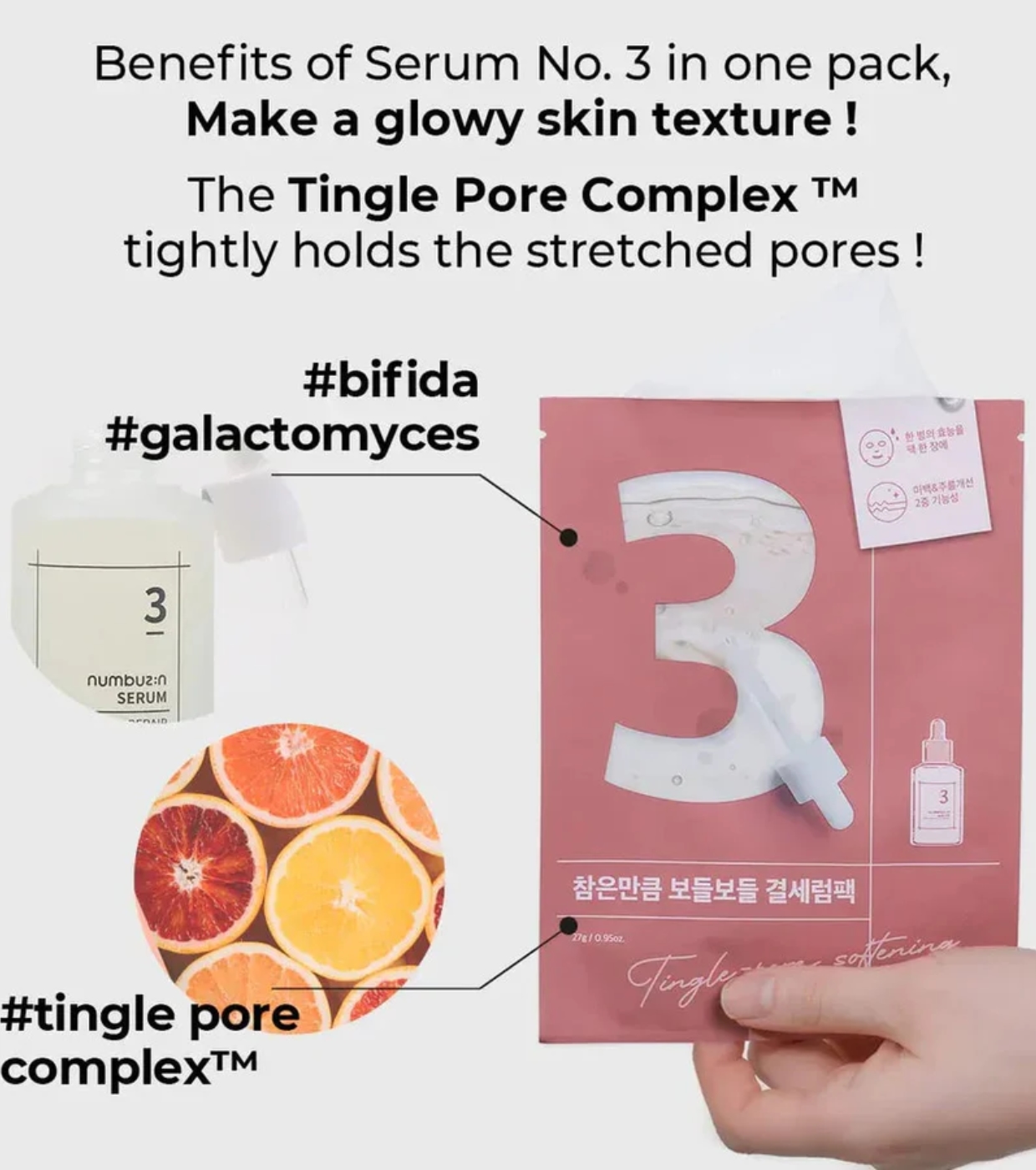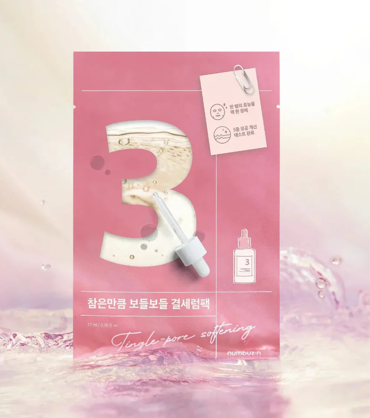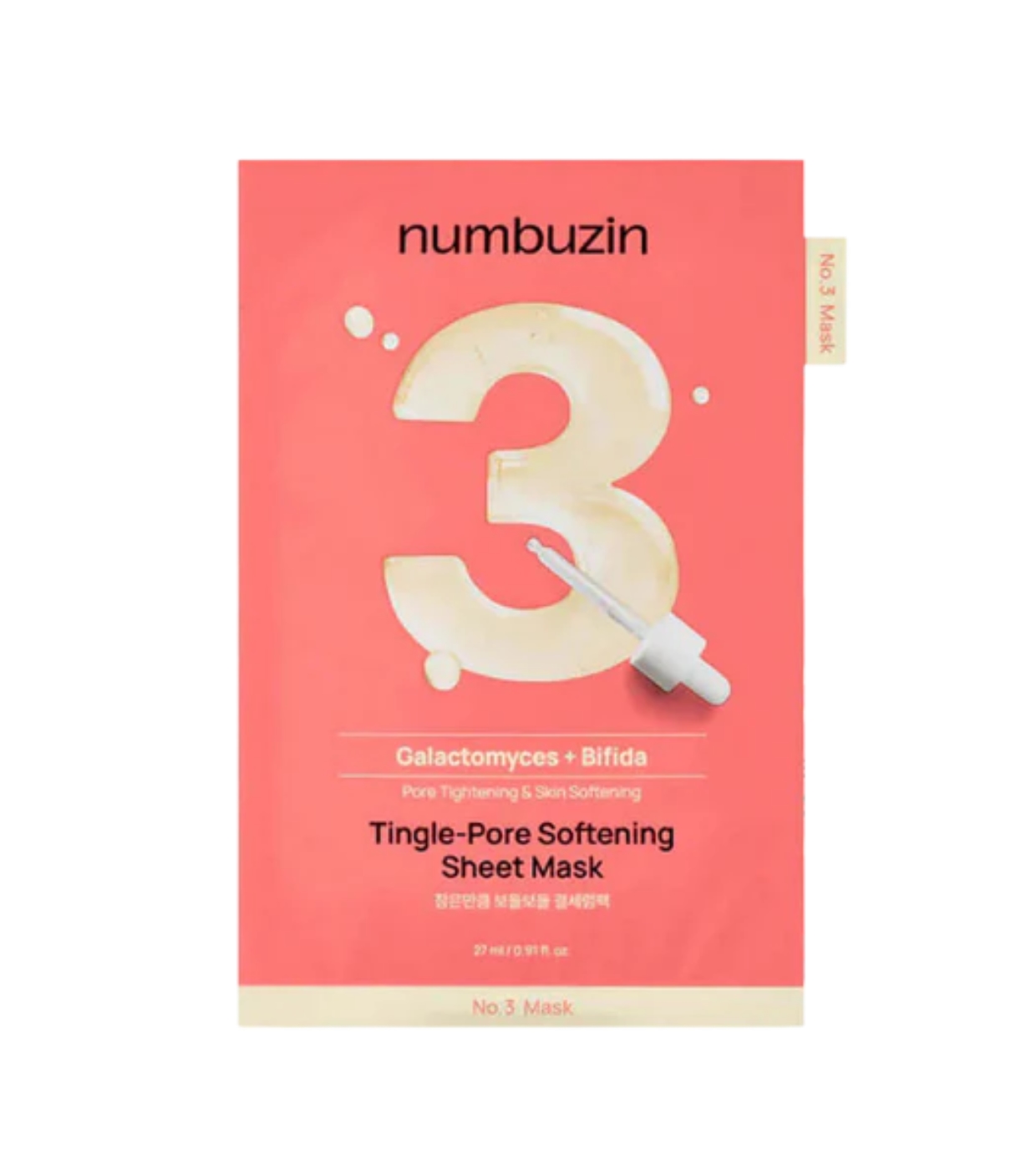 Affina la grana della tua pelle e riduci visibilmente i pori con la No.3 Tingle-Pore Softening Sheet Mask di Numbuzin , la maschera in tessuto coreana studiata per trattare pori dilatati, discromie e pelle con texture irregolare.