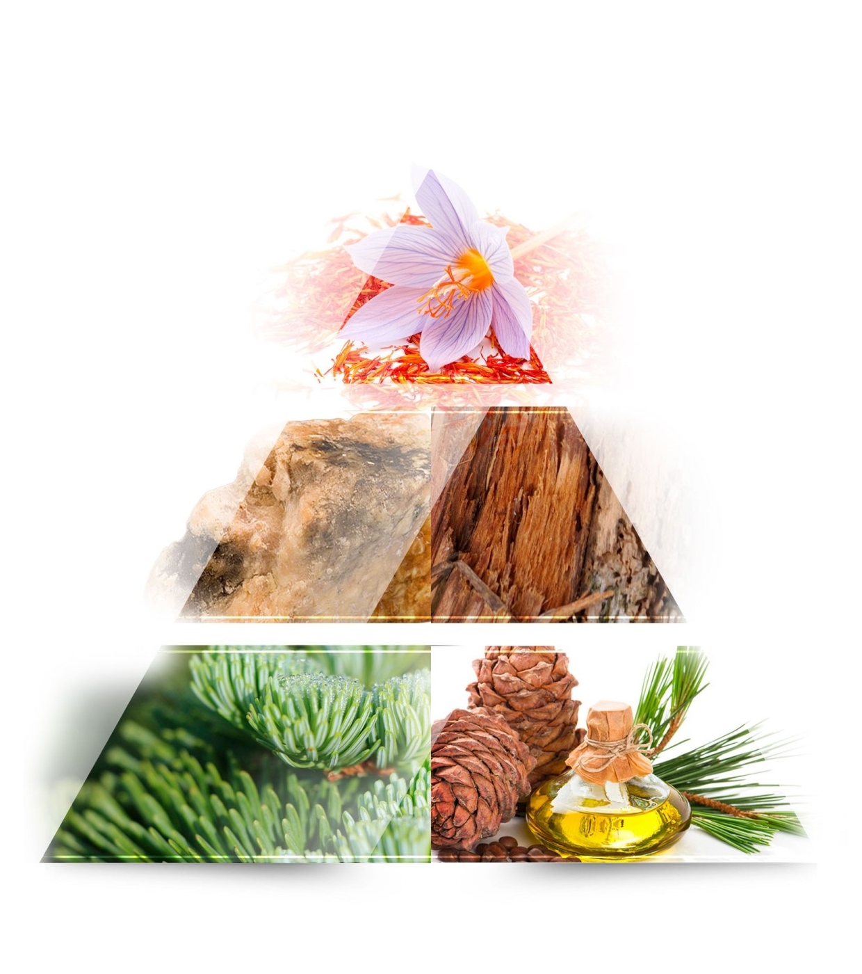 Nel suo cuore, note di ambra grigia e legno d'ambra conferiscono profondità e personalità, mentre la base di resina di abete e cedro lascia una scia calda, avvolgente e persistente.