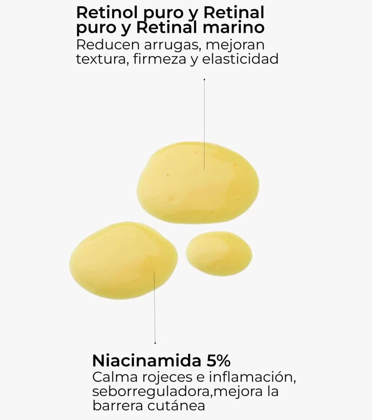 - 1 x SIERO TRIPLO RETINOIDE (30 ml): Siero notte con retinolo puro allo 0,3%, retinale puro allo 0,15% e retinale marino all'1%; con niacinamide al 5%, centella asiatica, liquirizia e vitamina E; Azione anti-età intensiva: rughe, pori, compattezza, consistenza e tono.