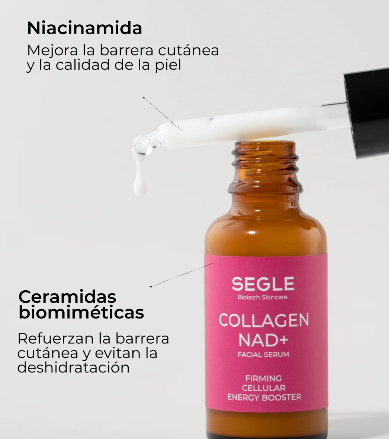 Il siero Collagen NAD+ di SEGLE è un trattamento rassodante intelligente avanzato che riattiva il collagene e l'energia cellulare, rafforzando al contempo la funzione barriera e aumentando la longevità della pelle.