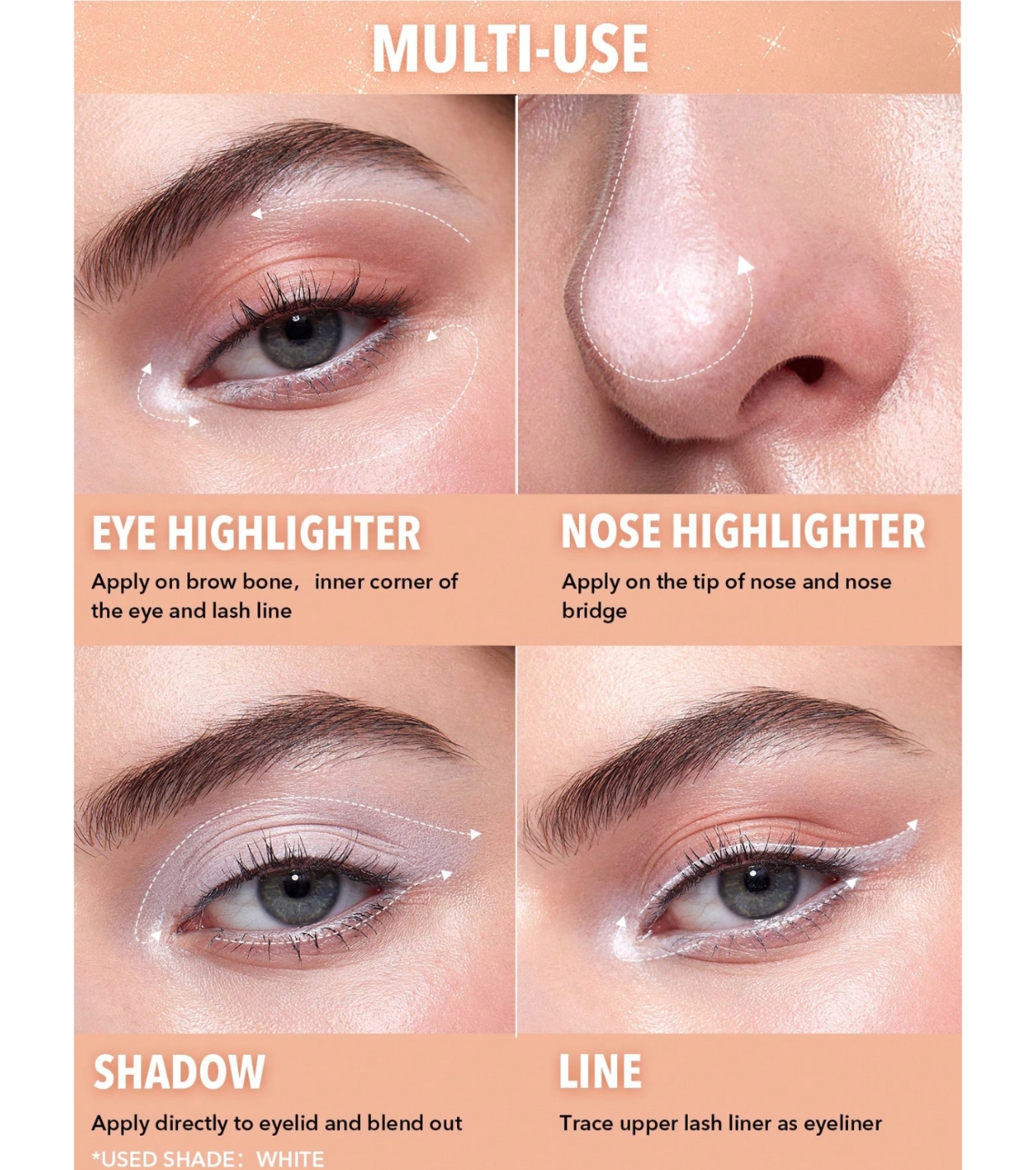 Applicalo direttamente sulla palpebra e sfumalo con le dita o con un pennello per un finish delicato. Puoi anche usarlo nell'angolo interno dell'occhio o sotto l'arcata sopracciliare per aggiungere un tocco di luce.