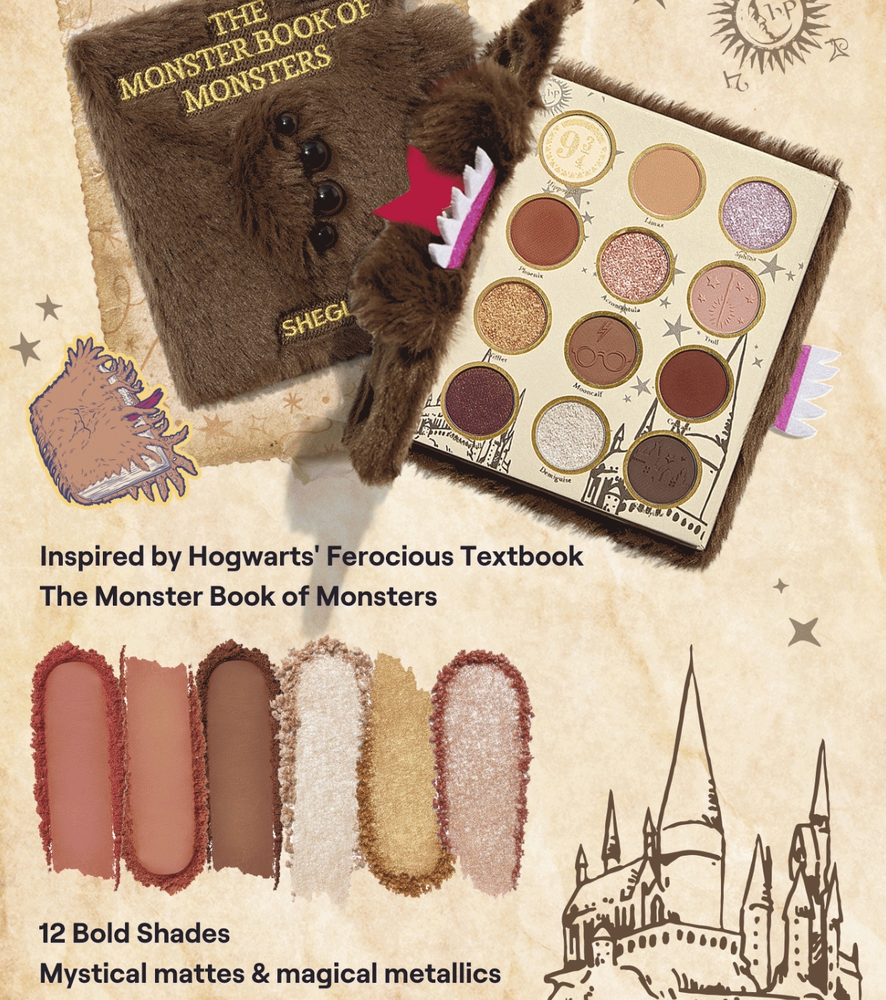 Scatena il tuo lato più audace con la palette di ombretti Monster Book of Monsters di SHEGLAM , ispirata al libro di testo più feroce di Hogwarts.