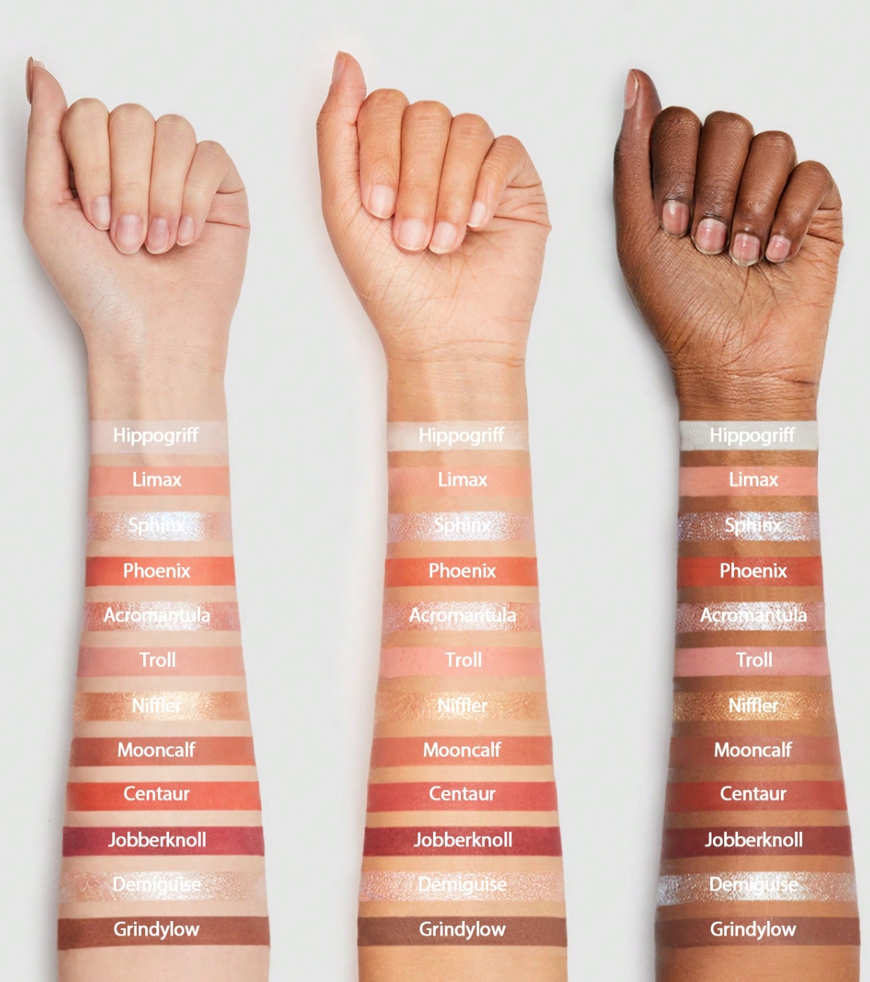 Troll+Phoenix+Mooncalf+Grindylow+Centaur INGREDIENTS: TALC, MICA, SYNTHETIC FLUORPHLOGOPITE, SILICA, DIMETHICONE, SYNTHETIC WAX, MAGNESIUM STEARATE, TRIETHOXYCAPRYLYLSILANE, CAPRYLIC/CAPRIC TRIGLYCERIDE, TRIMETHYLSILOXYSILICATE, LAUROYL LYSINE, PHENOXYETHANOL, CAPRYLYL GLYCOL, ETHYLHEXYLGLYCERIN, TOCOPHERYL ACETATE, MAY CONTAIN/PEUT CONTENIR: TITANIUM DIOXIDE(CI 77891), IRON OXIDES(CI 77491, CI 77492, CI 77499), ULTRAMARINES(CI 77007), RED 7 LAKE(CI 15850).