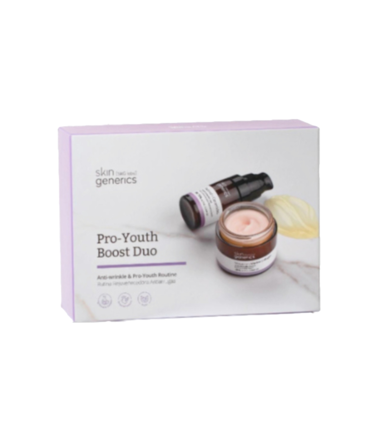Il Pro-Youth Boost Duo di Skin Generics è un trattamento anti-età completo studiato per ringiovanire la pelle, migliorarne la tonicità e ridurre visibilmente le rughe, combinando due formule ad alte prestazioni che agiscono in sinergia.