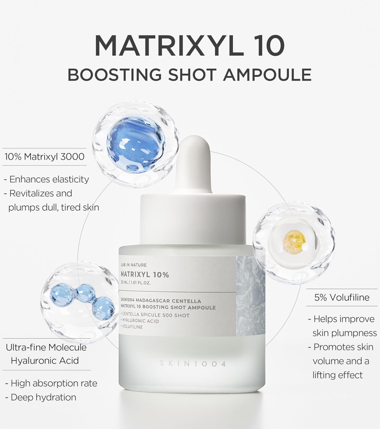 Restituisci alla tua pelle spenta la vitalità di cui ha bisogno con la fiala Lab in Nature Madagascar Centella Matrixyl 10 di SKIN1004 .