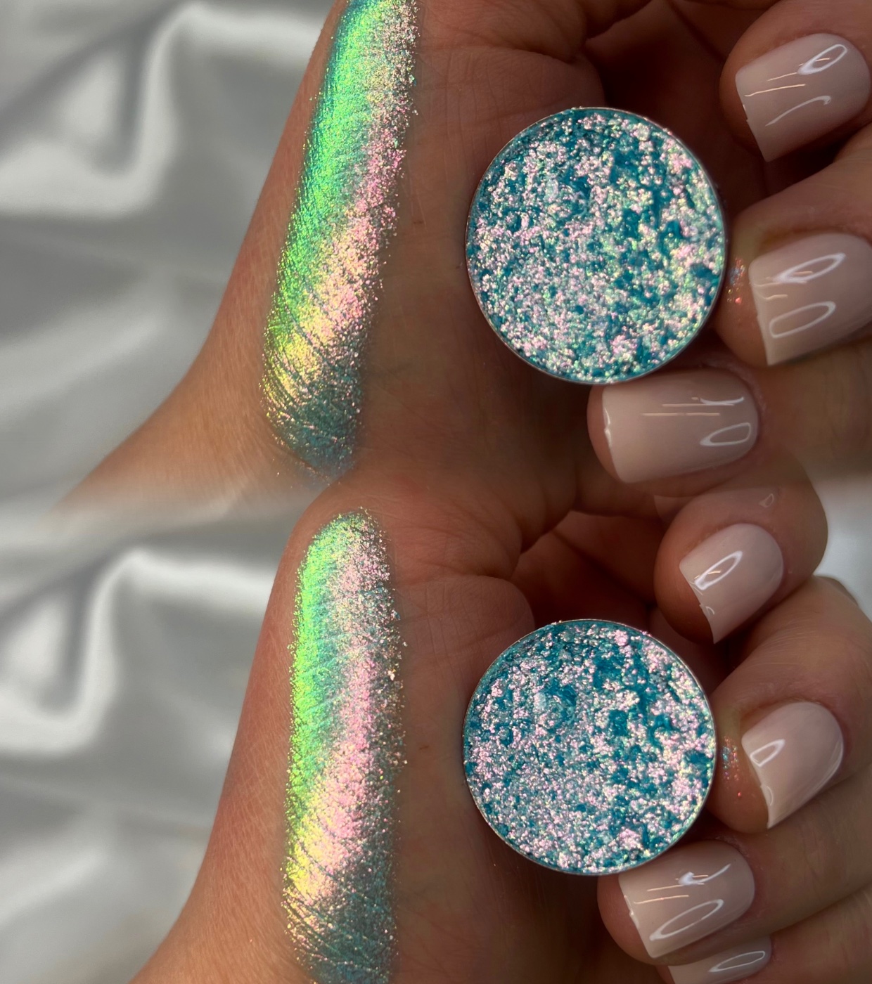 Gli ombretti singoli multicromatici Pastel Roses offrono una finitura spettacolare che cambia colore a seconda dell'angolazione della luce.
