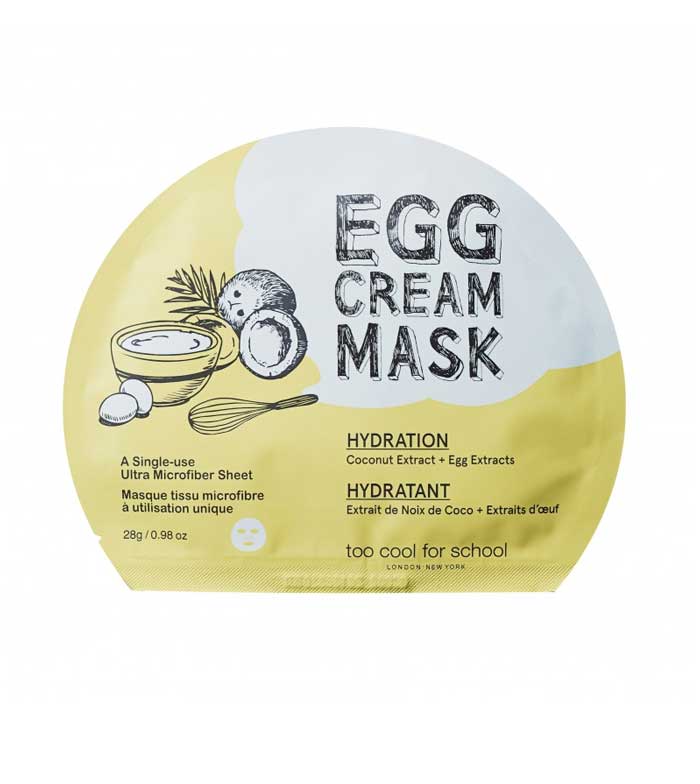 La Egg Cream Mask Hydration di Too cool for school è una maschera viso altamente nutriente formulata con estratto di uova, acqua di cocco, niacinamide ed estratti botanici.
