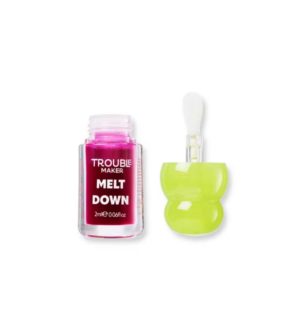 Melt Down Lip Oil di Trouble Maker è pura cura di sé in un tubetto: un'irresistibile combinazione di nutrimento, lucentezza e morbidezza per labbra irresistibili.