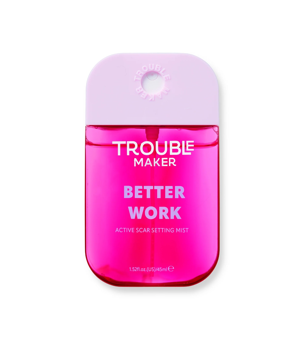 Trouble Maker Better Work Anti-Redness Setting Spray è lo spray fissante definitivo per un trucco a lunga tenuta con ulteriori benefici per la cura della pelle.