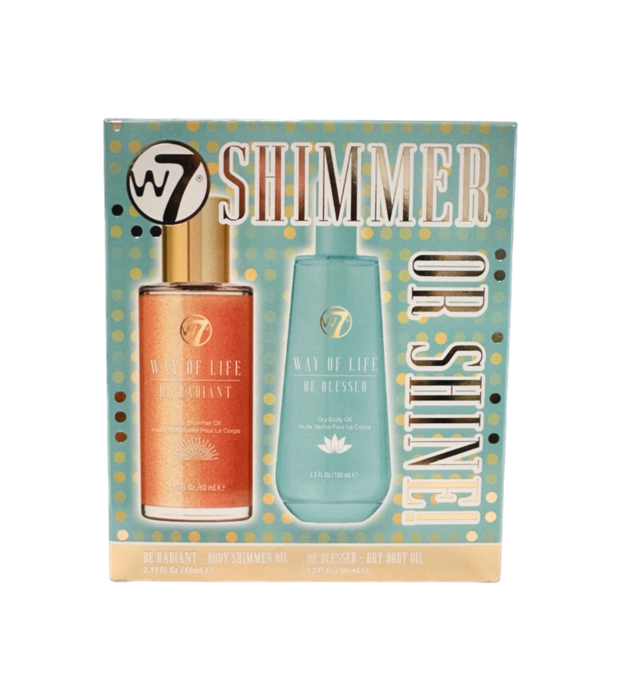 Ottieni una pelle radiosa e nutrita con il W7 Shimmer or Shine Set, un duo di oli per il corpo studiati per idratare e valorizzare la tua bellezza naturale.